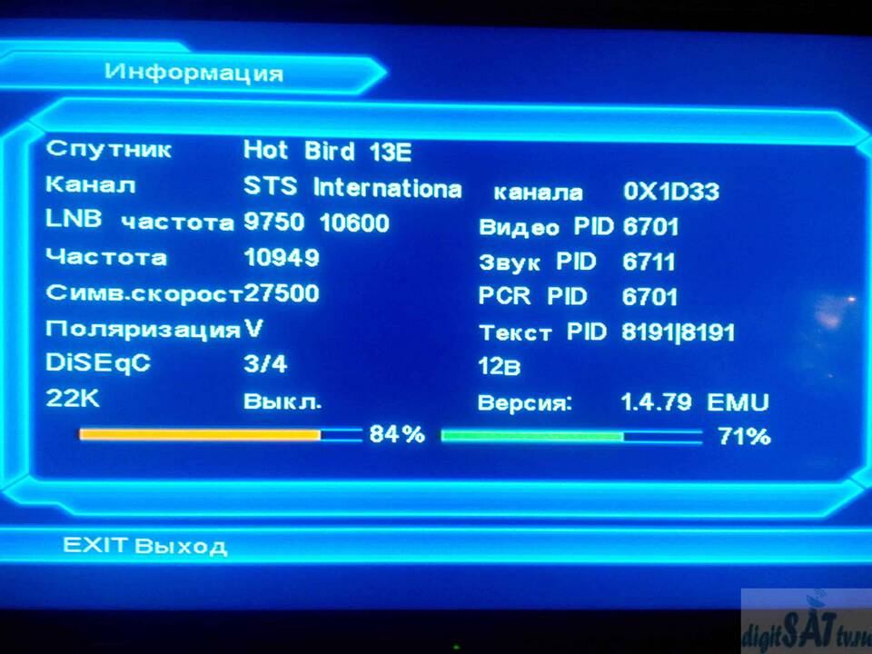 - Транспондер: 12226 МГц (H, 27500, 3/4)